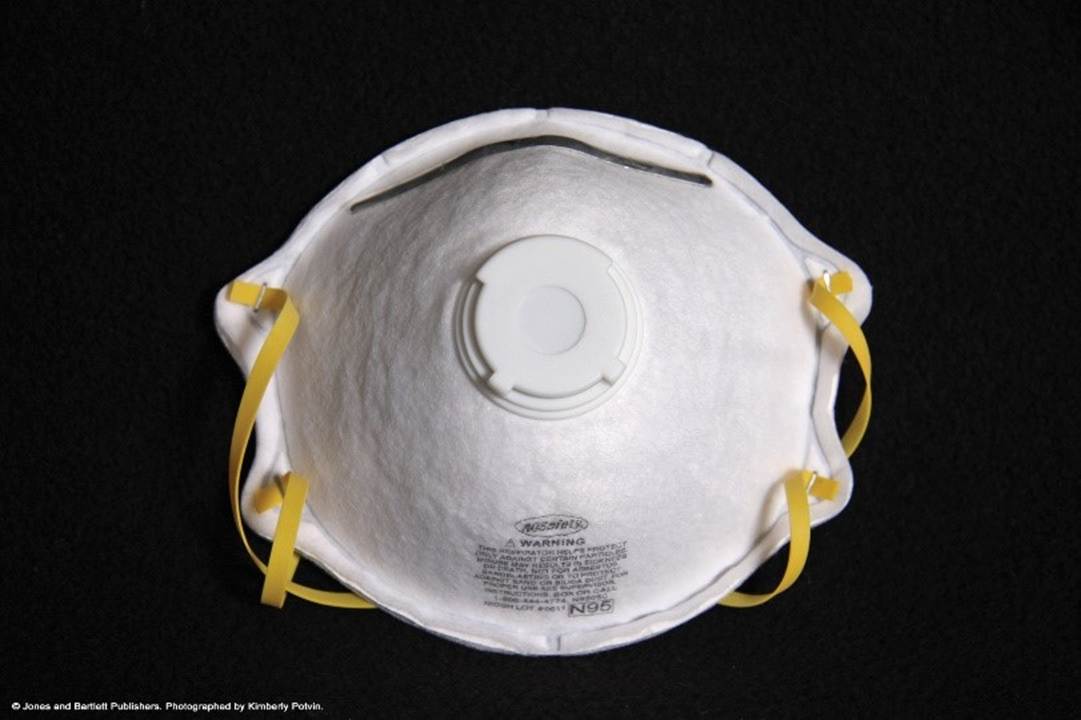 Respirators cover the nose and mouth with N95 protection or higher to prevent airborne transmission of infectious agents. These reduce the HCP’s risk of inhaling hazardous airborne particles, gases, or vapors. Respirators are reserved for case-specific aerosolizing procedures where airborne particulates create a high risk of infection for the HCP. OSHA standards require that National Institute for Occupational Safety and Health (NIOSH)-approved N95 filtering facepiece respirators or higher be used when in contact with patients with certain suspected or confirmed airborne-transmitted diseases, such as tuberculosis or measles. In addition, these masks must meet requirements to filter a minimum of 95% of 0.3 µm-size particles and require fit testing. Most N95 respirators are single-use and disposable (refer to Figure 7), which tend to be lighter and less cumbersome for the wearer. Reusable options include elastomeric and powered air-purifying respirators (PAPR; refer to Figure 8). Some of these options have the advantage of also providing face and eye protection in one unit, as well as reducing the risk of self-contamination. Respirators are intended for protection against solids; they are highly durable devices and have a soft and comfortable inner surface, adjustable nosepiece, and secure head straps to provide a proper fit (CDC, 2022; Potter et al., 2023; Siegel et al., 2024, pp. 56–57).