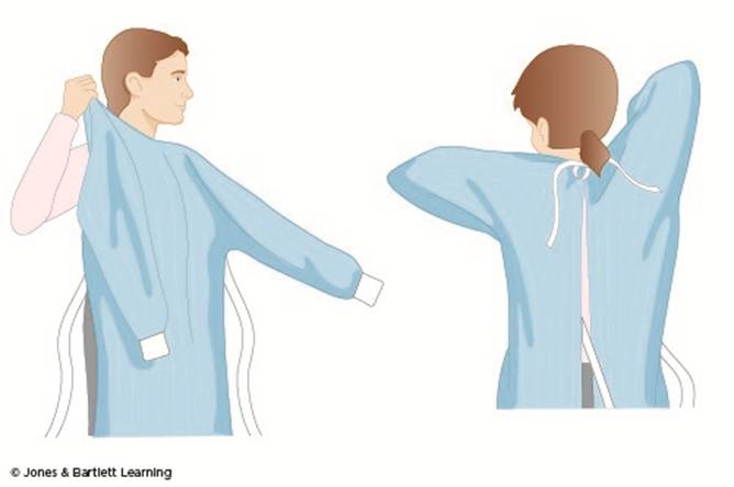 - with the gown opening toward the back, put arms through the sleeves one at a time and pull the gown over the shoulders; secure the gown at the neck and waist using the provided closure mechanism (Potter et al., 2023)